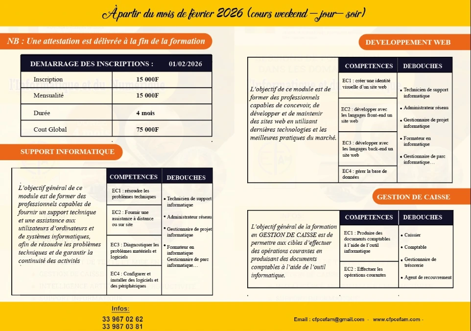 Dans un monde en constante évolution, le CEFAM s’engage à préparer la jeunesse aux défis professionnels de demain. À travers des formations innovantes, axées sur les secteurs porteurs comme l’industrie, le commerce et le numérique, nous dotons nos apprenants de compétences pratiques et modernes.. .
